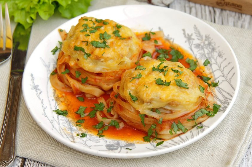 - Tagliatelleri bir kaşıkla çıkarın ve hemen bitkisel yağ ile yağlanmış bir fırın tepsisine yerleştirin,