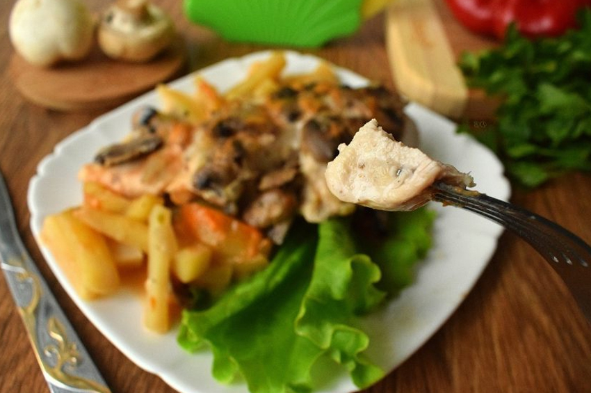 - Tavuk göğsü, soğan ve mantarı üstüne koyun,