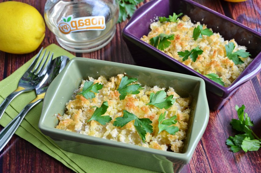 - Üzerine ekmek kırıntıları serpin ve eritilmiş tereyağını dökün,