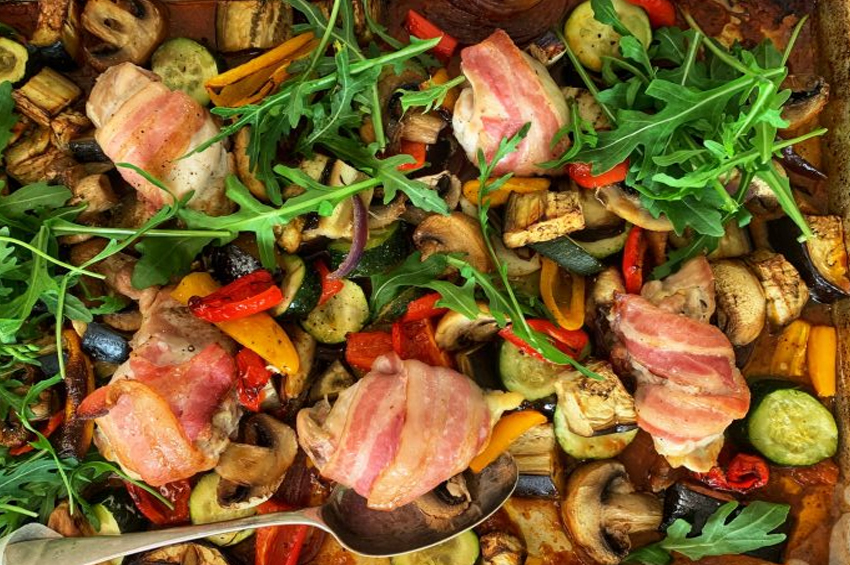- Tavuğu sebzelerin üzerine yerleştirin ve tavuk pişene, pastırması gevrekleşmeye ve sebzeler yumuşayana kadar pişirin,