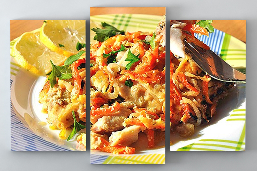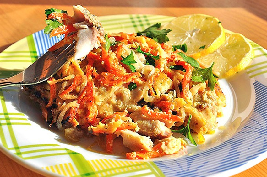 - Şimdi filetoyu bir fırın tepsisine aktarın, ilk önce kızarmış soğanı, üstüne de havucu koyun,