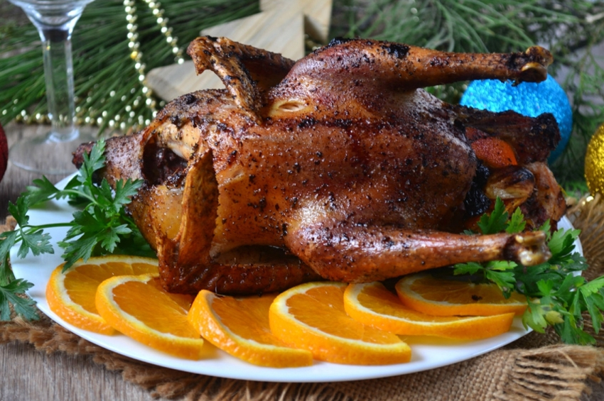 - Portakal dilimlerini kuru erik ve soyulmuş sarımsakla karıştırın, elde edilen karışımla tavuğu doldurun,