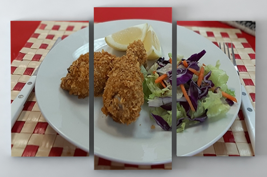 - Tavuğu terbiyeli kepekli unla kaplayın, yumurta karışımına daldırın ve ezilmiş mısır gevreği ile kaplayın,