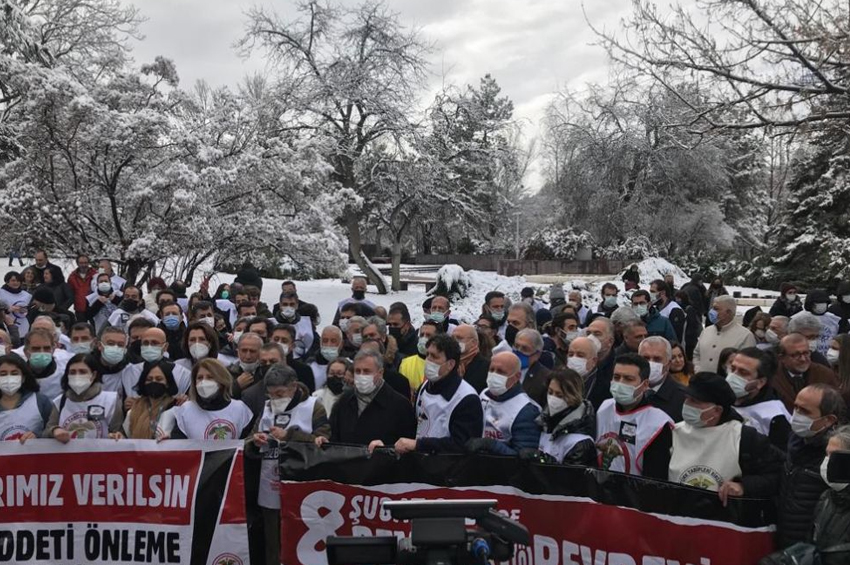 Bugün, Covid-19’a bağlı hekim ölümlerinde ve hastalanmada Türkiye halen en üst sıralarda iken; iktidar çalışma koşullarımızda hiçbir gerekli önlemi almadığı gibi ölen mesai arkadaşlarımızın da Covid-19’a bağlı öldüğünün kanıtlanmasını bizlerden isteyecek kadar da duygusuzlaşmıştır demek için buradayız. Covid-19 aşısına kadar her 30 dakikada bir sağlık çalışanını bu enfeksiyondan kaybettik. İşte bu sebeplerden artık yeter Covid-19 Meslek Hastalığı amasız fakatsız hızla çıkarılmalıdır demek için buradayız.