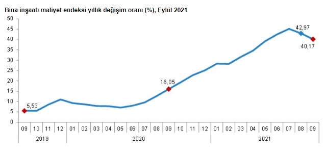 Bina inşaatı maliyet endeksi, eylülde bir önceki aya göre yüzde 0,19, geçen yılın aynı ayına göre yüzde 40,17 arttı. Bir önceki aya göre malzeme endeksi yüzde 0,37 yükselirken, işçilik endeksi yüzde 0,27 azaldı. Ayrıca geçen yılın aynı ayına göre malzeme endeksi yüzde 48,58, işçilik endeksi yüzde 22,27 artış kaydetti.