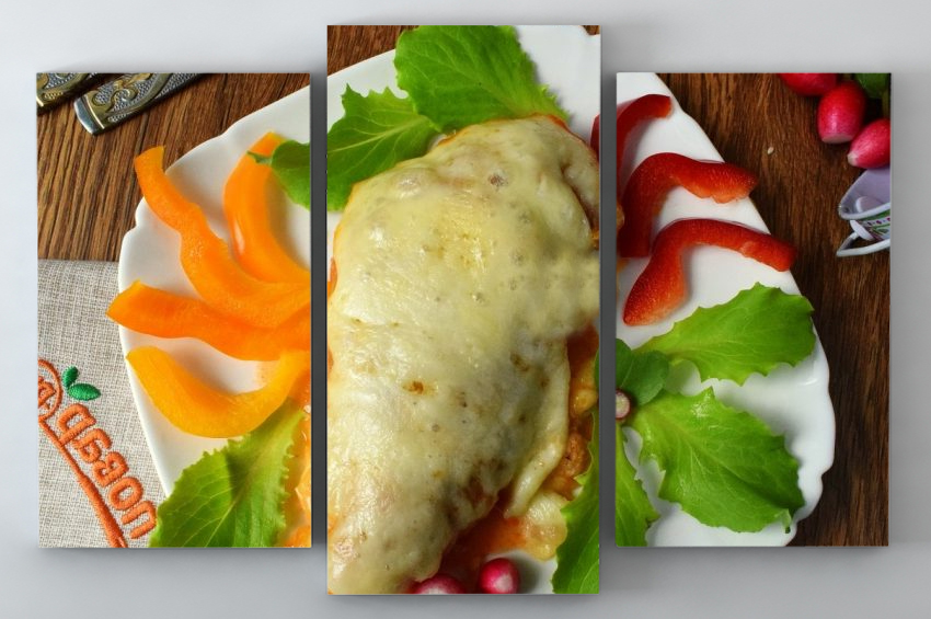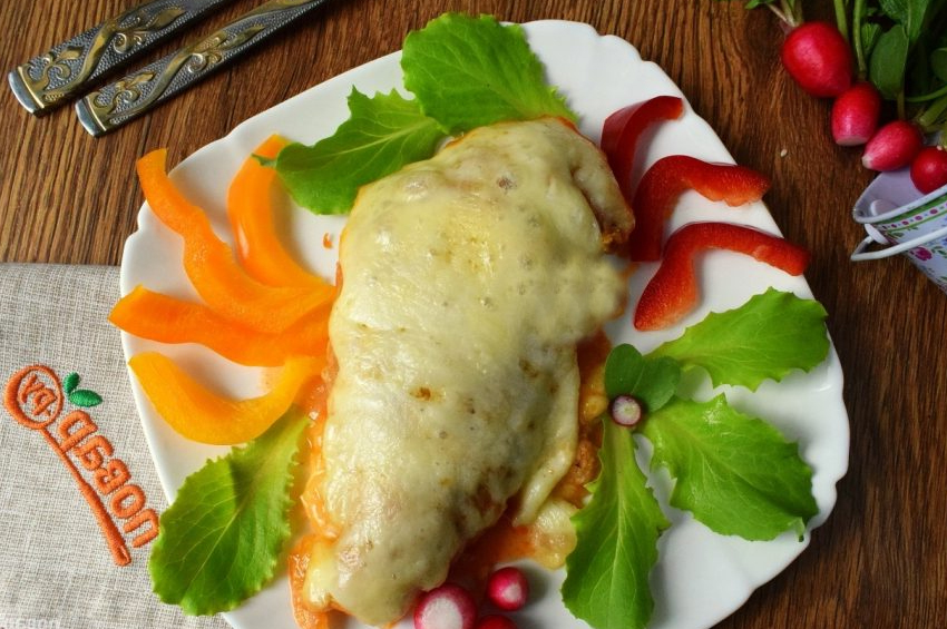 - Tavuk göğüslerini domates sosuna batırın, bir fırın kabına koyun, üzerine rendelenmiş parmesan serpin, mozzarella dilimlerini koyun,