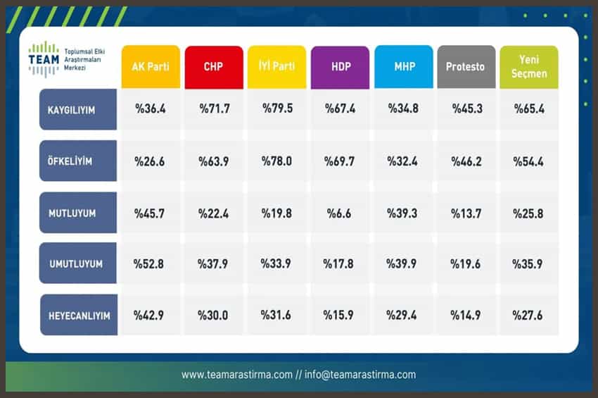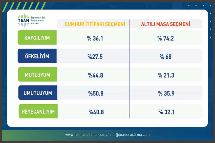 TEAM, araştırma analizinin devamında şu açıklamayı yaptı: “Seçmenlere Türkiye’deki siyaseti düşündüklerinde nasıl bir duygu durumu içinde olduklarına yönelik sorular da yönelttik. Muhalif seçmenlerde ve yeni seçmenlerde kaygı yüksek, umut, heyecan ve mutluluk seviyeleri düşük.”