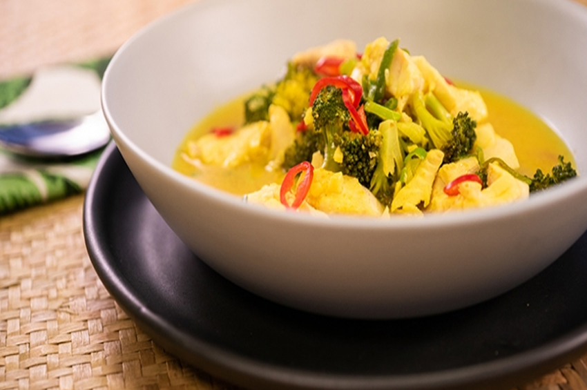 - Hindistan cevizi kreması, su, balık sosu, limon suyu, bulyon, köri tozu, zencefil ve sarımsağı geniş bir tencereye koyun ve kaynatın,
