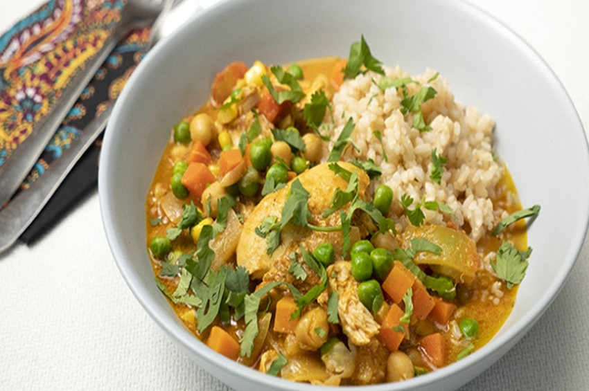 - Tencereye sarımsak, tavuk, köri tozu ve garam masala ekleyin ve 5 dakika hafifçe pişirin,