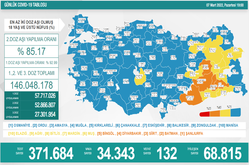 Bakanlığın tablosuna göre Türkiye’de en çok aşılamanın gerçekleştirildiği Osmaniye’yi, Ordu, Amasya, Muğla, Kırklareli, Çanakkale, Eskişehir, Balıkesir, Zonguldak ve Manisa takip etti. Bakanlığın tablosuna göre Türkiye’de en az aşılamanın gerçekleştirildiği Şanlıurfa’yı sırasıyla Batman, Siirt, Diyarbakır, Bingöl, Muş, Mardin, Bitlis, Ağrı ve Elazığ takip etti.
