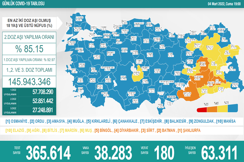 Bakanlığın tablosuna göre Türkiye’de en çok aşılamanın gerçekleştirildiği Osmaniye’yi, Ordu, Amasya, Muğla, Kırklareli, Çanakkale, Eskişehir, Balıkesir, Zonguldak ve Manisa takip etti. Bakanlığın tablosuna göre Türkiye’de en az aşılamanın gerçekleştirildiği Şanlıurfa’yı sırasıyla Batman, Siirt, Diyarbakır, Bingöl, Muş, Mardin, Bitlis, Ağrı ve Elazığ takip etti.