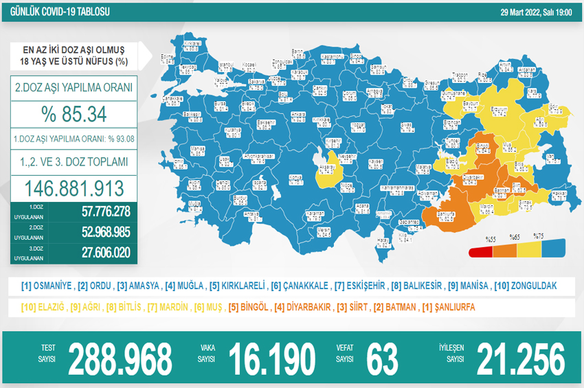 Bakanlığın tablosuna göre Türkiye’de en çok aşılamanın gerçekleştirildiği Osmaniye’yi, Ordu, Amasya, Muğla, Kırklareli, Çanakkale, Eskişehir, Balıkesir, Manisa ve Zonguldak takip etti. Bakanlığın tablosuna göre Türkiye’de en az aşılamanın gerçekleştirildiği Şanlıurfa’yı sırasıyla Batman, Siirt, Diyarbakır, Bingöl, Muş, Mardin, Bitlis, Ağrı ve Elazığ takip etti.