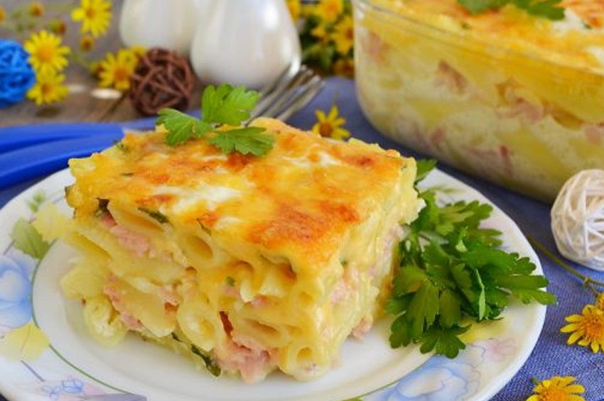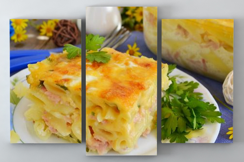 - Alta ince bir tabaka makarna koyun, üzerine biraz jambon yayın, peynir karelerine dizin,