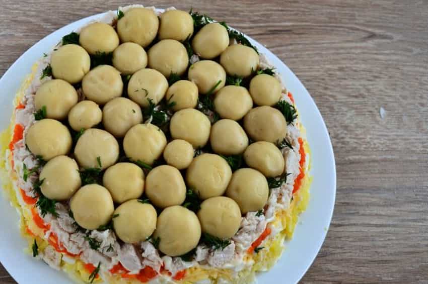 Dereotunu ince ince kıyıp mantarların üzerine serpin. Tavuk göğsünü küçük parçalar halinde kesin ve bir sonraki katman olarak yerleştirin. Ağ şeklinde mayonez serpin.