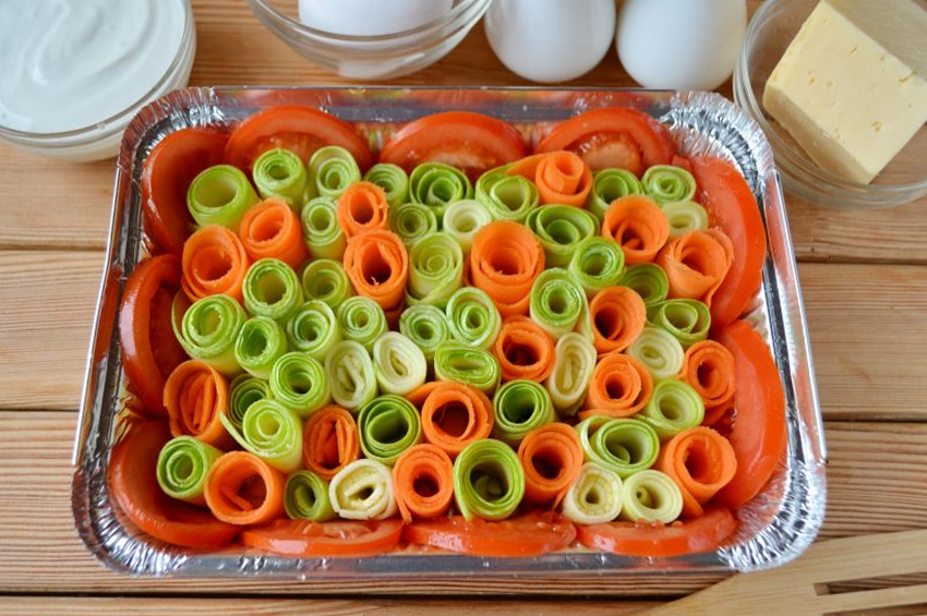 - Bir sebze soyucu kullanarak kabak ve havucu rulo haline getirin,