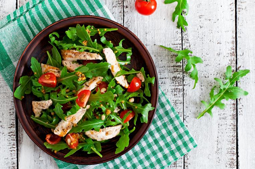 - Rokaları tabaklara yerleştirin. Tavukları 2 cm’lik şeritler halinde dilimleyin. Tavukları rokaların üzerine dizin ve domatesleri tabağa dökün,