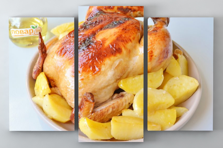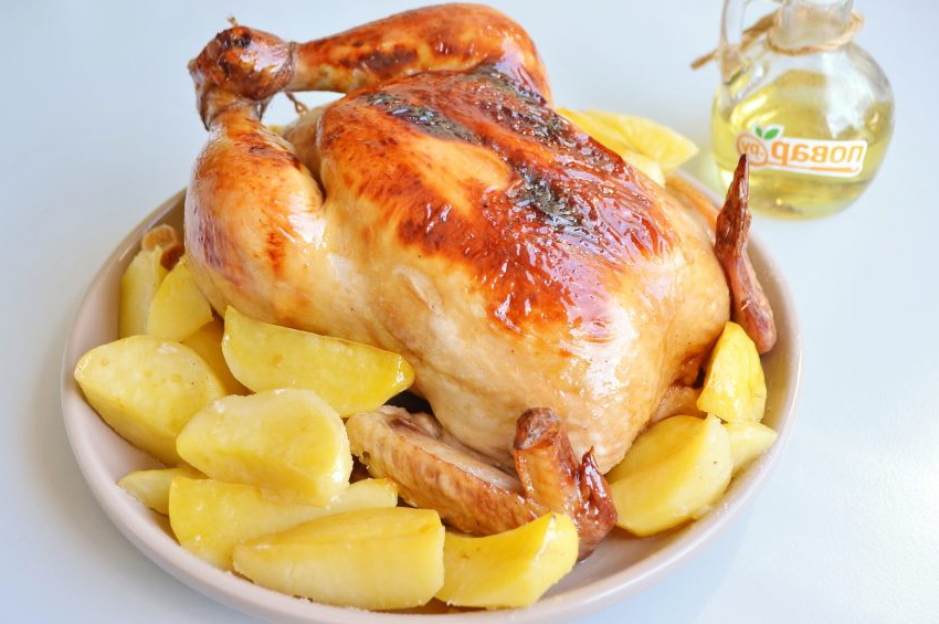 - Tavuğu bir fırın tepsisine koyun, çevresine patates yerleştirin, 60-80 dakika pişirin,