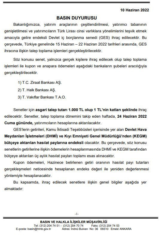 Türkiye lirası cinsi varlıklara yönelimlerin teşvik edilmesi amacıyla ihraç edilecek devlet iç borçlanma senedi (GES) ihracına ilişkin talep toplama işlemleri, Türkiye genelinde 15-22 Haziran’da yapılacak.