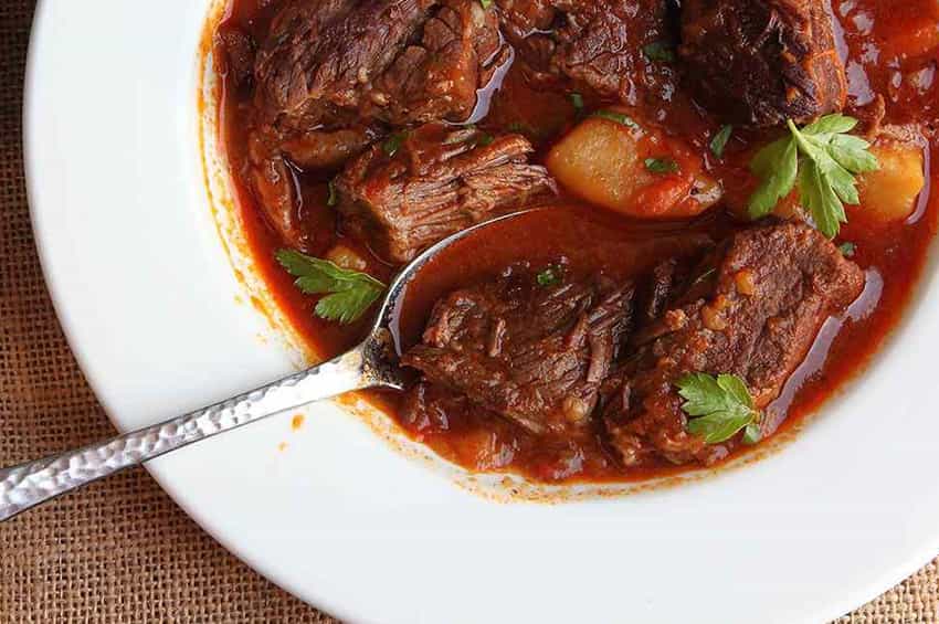 Et suyunu ve domatesi ilave edip kaynamaya bırakın. Ardından kızarmış etleri karışımı iyice karıştırıp bir fırın tepsisine koyun. Önceden ısıtılan fırında 2,5 saat pişirin.