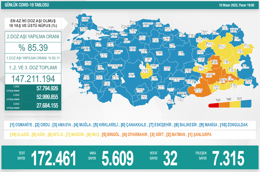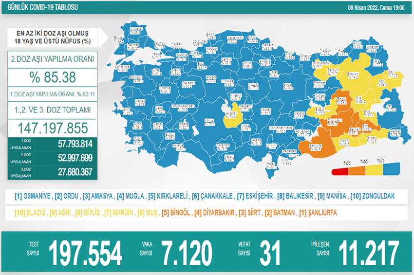 “Her geçen gün bunun azaldığını görüyoruz. Ağrı’da, Uşak’ta, Gümüşhane’de, Bayburt’ta, Artvin’de yoğun bakım yataklarımızda şu anda hastamızın olmadığını söyleyebiliriz. Buna benzer toplam 19 ilimizde yoğun bakım yataklarımızda şu anda hastamızın olmadığını söyleyebiliriz” dedi.