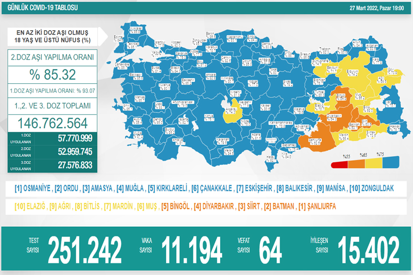 Bakanlığın tablosuna göre Türkiye’de en çok aşılamanın gerçekleştirildiği Osmaniye’yi, Ordu, Amasya, Muğla, Kırklareli, Çanakkale, Eskişehir, Balıkesir, Manisa ve Zonguldak takip etti. Bakanlığın tablosuna göre Türkiye’de en az aşılamanın gerçekleştirildiği Şanlıurfa’yı sırasıyla Batman, Siirt, Diyarbakır, Bingöl, Muş, Mardin, Bitlis, Ağrı ve Elazığ takip etti.