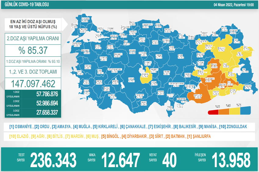 Bakanlığın 04 Nisan verilerine göre, 236 bin 343 test yapılmıştı. 12 bin 647 vaka tespit edilirken, 40 kişi hayatını kaybetmiş ve 13 bin 958 kişi sağlığına kavuşmuştu.
