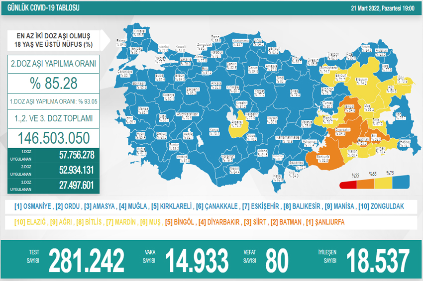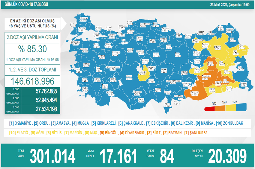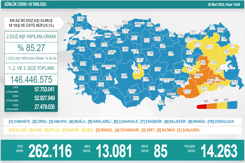 Bakanlığın tablosuna göre Türkiye’de en çok aşılamanın gerçekleştirildiği Osmaniye’yi, Ordu, Amasya, Muğla, Kırklareli, Çanakkale, Eskişehir, Balıkesir, Manisa ve Zonguldak takip etti. Bakanlığın tablosuna göre Türkiye’de en az aşılamanın gerçekleştirildiği Şanlıurfa’yı sırasıyla Batman, Siirt, Diyarbakır, Bingöl, Muş, Mardin, Bitlis, Ağrı ve Elazığ takip etti.