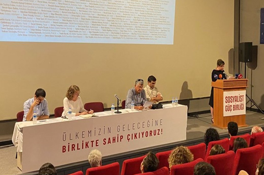 Prof. Dr. Gamze Yücesan Özdemir tarafından okunan bildiride, “Biz aşağıda imzası olanlar, bu bilinçle ülkemizin eşit, özgür ve bağımsız geleceği için birlikte hareket etmek, emekçi halkın hayati sorunlarının kaynağına karşı ortak bir mücadele geliştirmek üzere aşağıdaki temel mücadele hedefleri doğrultusunda bir araya geliyoruz. Tüm yurtsever insanlarımızı ülkemizin geleceğine birlikte sahip çıkmaya çağırıyoruz” denildi.