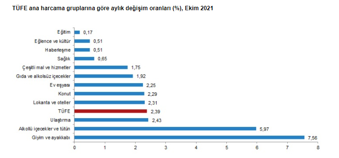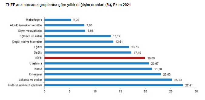 Yıllık en düşük artış yüzde 10,76 ile haberleşme ana grubunda gerçekleşti. Bir önceki yılın aynı ayına göre artışın düşük olduğu diğer ana gruplar sırasıyla yüzde 18,67 ile eğitim, yüzde 25,32 ile giyim ve ayakkabı ve yüzde 28,63 ile sağlık oldu. Buna karşılık, bir önceki yılın aynı ayına göre artışın yüksek olduğu ana gruplar ise sırasıyla, yüzde 68,89 ile ulaştırma, yüzde 55,61 ile gıda ve alkolsüz içecekler, yüzde 54,53 ile ev eşyası oldu.