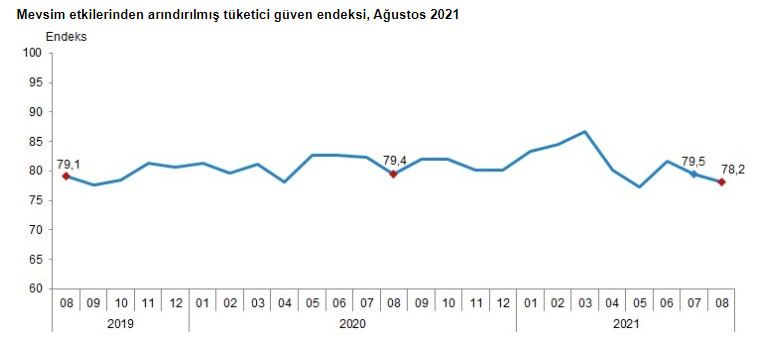 Haber Merkezi / Türkiye İstatistik Kurumu (TÜİK) Tüketici Güven Endeksi Ağustos 2022 verilerini açıkladı. Buna göre, tüketici güven endeksi, ağustosta geçen aya göre yüzde 6,1 arttı. Temmuzda 68 olan endeks, ağustosta 72,2 olarak kayıtlara geçti.