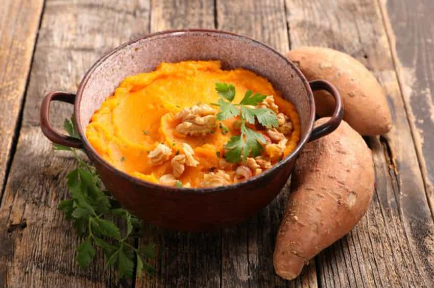 Tatlı patatesler pişince ezin ve bir süzgeçten geçirin. Püreyi tencereye geri koyun ve biraz su ile gevşetin. Baharat dengesini düzenleyin ve kıyılmış cevizlerle servis yapın. Afiyet olsun…