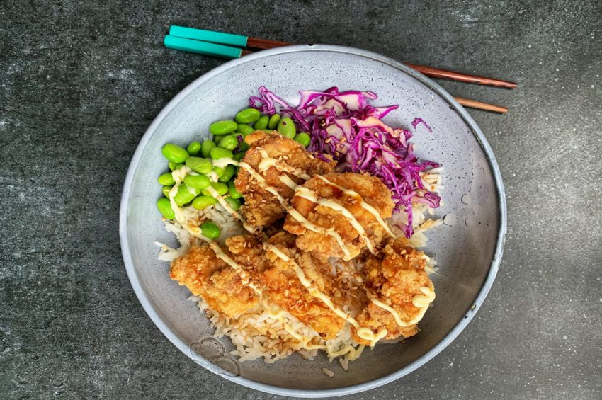 - Pirinci tavukla servis edin, üzerine mayonez ve teriyaki sos gezdirin, susam serpin ve yanına salata ve edamame fasulyesi koyun,