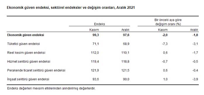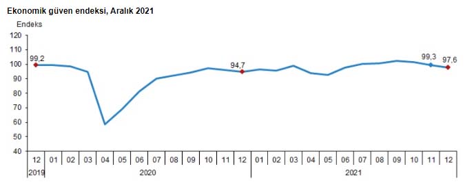 Türkiye İstatistik Kurumu (TÜİK), ‘Aralık 2021 Ekonomik Güven Endeksi’ verilerini açıkladı. Açıklanan verilere göre; Ekonomik güven endeksi Kasım ayında 99,3 iken, Aralık ayında yüzde 1,8 oranında azalarak 97,6 değerine düştü.