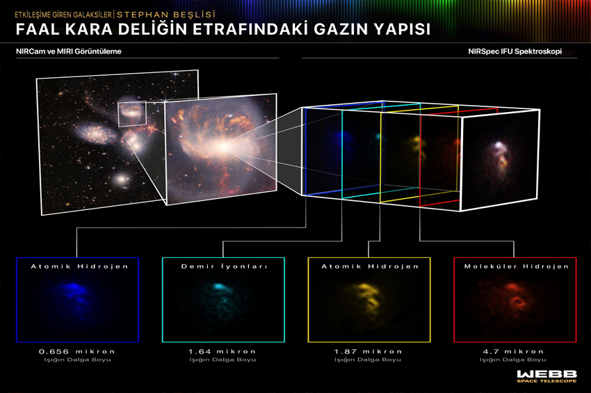 NASA ve ortak ajanslar, Webb’in tam renkli ilk 5 fotoğrafından ilki olan Stephan Beşlisi görüntüsünü 12 Temmuz’da yayımlamıştı. Webb ise kısa zaman önce, yakın kızılötesi spektrometresini, diğer deyişle NIRSpec cihazını, görüntünün en üstünde görünen galaksinin kalbindeki süper kütleli kara deliğe yönelmişti. Resimdeki 5 galaksi de birbirine yakın gibi görünse de gerçekte 5. galaksi dünyaya en yakın olanı.